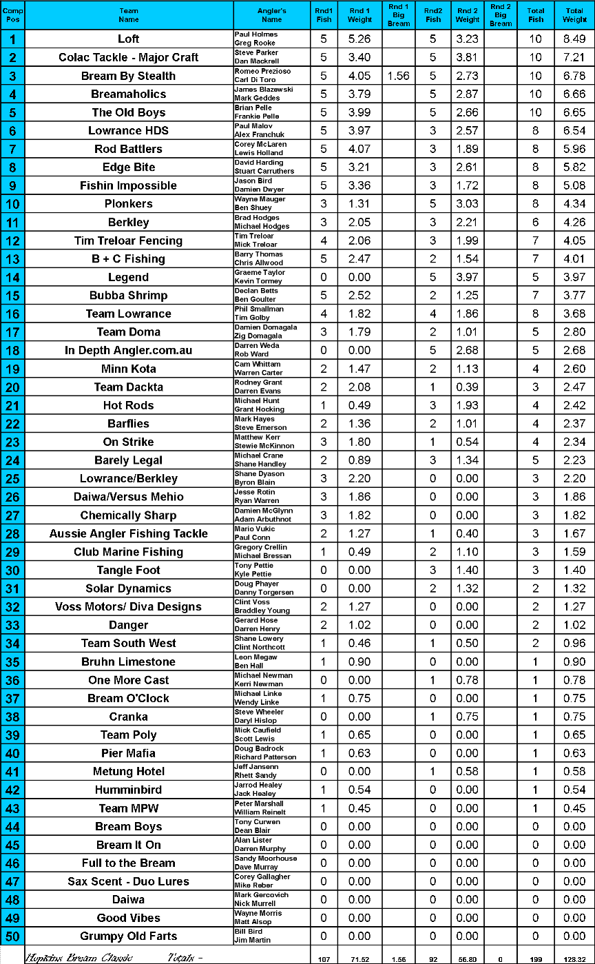 Team Loft Paul Holmes and Greg Rooke use the mighty Cranka Crab to break through for their first Vic Bream Classic Victory in fine style by over 1.2kg on 2nd Place smashing 10/10 for 8.49kg