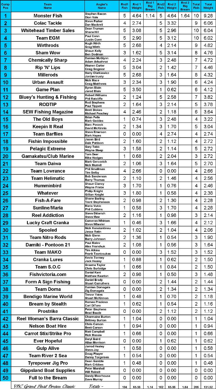 With the rain being replaced with howling wind on the Sunday morning it was going to very tough for Team Monster Fish to repeat the same technique from the previous day as the electric motor just didn't have the power needed to hold them against the strong south westerly gale. "We knew the bream would still be there, but we had to improvise a little in order to be able to work the lures as slowly as needed and the only option we had was to anchor in the one spot and wait for the bream to come up onto the flats and feed" Dion said. With more boats pushing down the front to try their luck at a better quality bream the fishing started to become much tougher than Saturday with the larger fish shutting down some what. In an attempt to finesse one of the big bruising Glenelg River bream into biting the boys changed lures, paying dividends. "We decided to change to a small 2 inch Berkley Gulp minnow grub in the watermelon colour along with the small 2 inch Berkley Gulp sand nugget and the fish really responded well to the smaller lure as we then managed to hook and land 5 more quality bream" Stephen said. With Day 2 finally over and nothing left to do but weigh in the boys pulled the pick and headed for the scales. Never really challenged Team Monster Fish weighed in another 5/5 bream for 4.64kg the exact same weight as yesterday but with one small difference. Sitting in their day 2 bag was a blue nosed beast that pulled the scales down at 1.64kg giving them the Eco-Gear Big Bream Prize, their bags of 4.64kg were also the heaviest of the weekend giving them the Berkley Best Bag Prize and to top it all off with a massive 10/10 for 9.28kg they took out the 2010 Humminbird Vic Bream Classic Invitational by a staggering 3.22kg