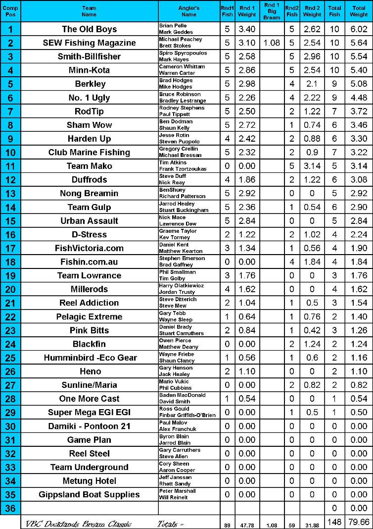 Heading to the weigh in on day 1 many teams who had landed quality bags were totally shocked to see just how many other teams had good bags. It seemed that the terrible conditions hadn't really deterred the black bream and it seemed that they were determined to feed no matter what the conditions which was welcome news to all the anglers. With a bag of 5/5 bream for 3.40kg that would win them the Atomic Bassday Best Bag prize for the weekend, Team The Old Boys had set a cracking day one lead that would be hard to beat. Sitting close in second position with 3.10kg on Day 1 and securing the Eco-Gear Big Bream with a quality fish of 1.08kg landed on a Cinnamon coloured Damiki MGrub was Team South East West Fishing Magazine's Michael Peachey and Brett Stokes.