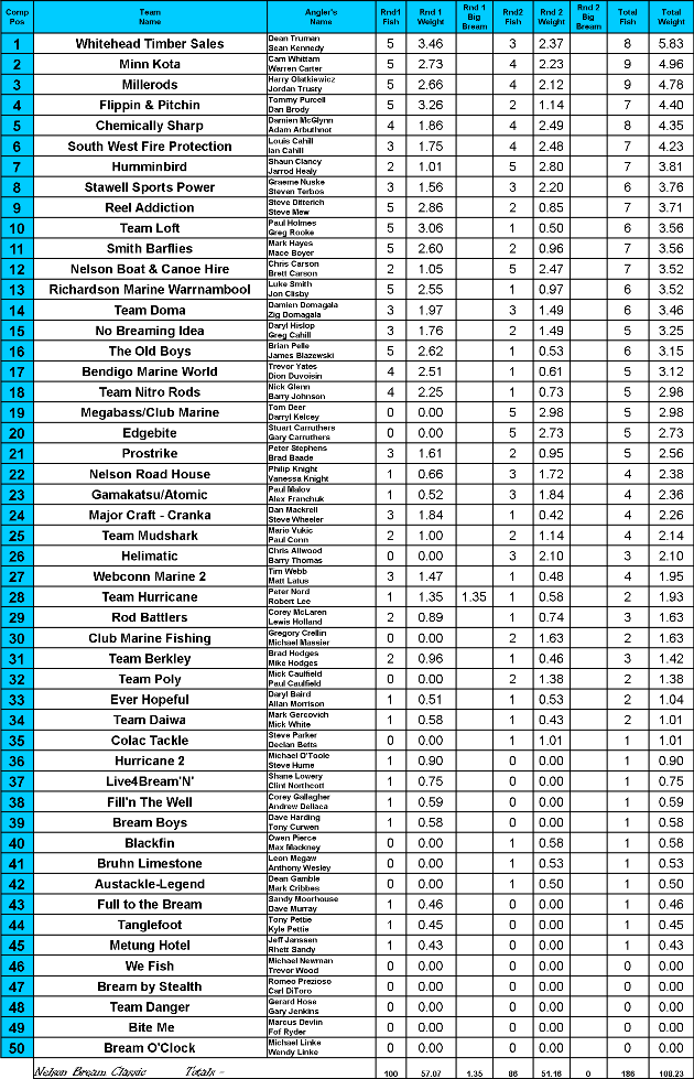 While Day 2 brought much more settled weather for the field the fishing suffered with the bite really shutting down. "We headed off first to the popes nose but the fishing bite had shut down and we only had one fish in the well at 11.30am. Fortunately we were able to catch 2 more legal fish in the last hour one of which weighed over a kilo to give us some hope of holding our lead" Dean said. Heading back to weigh in with only 3 fish in the well wasn't filling the boys with much confidence that they were going to claim victory however luck was on their side and the majority of the field also experienced the same difficult fishing conditions and very few heavy bags were weighed. With their Day 1 quality bag combined with their 3 bream on Day 2 that weighed in at 2.37kg Team Whitehead Timber Sales managed to hold on and were crowned the 2013 Hobie Bream Classic champions with 8/10 bream for 5.83kg. Coming from 40th position on Day 1 and moving 21 positions to finish 19th and taking out the Aus Tackle Monster Movers Prize was Team Mega Bass Club Marine's Tom Deer and Darryl Kelcey with a bag of 5/5 bream for 2.98kg.