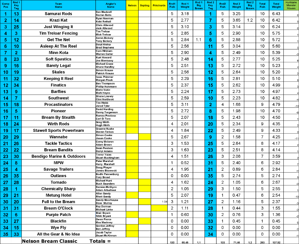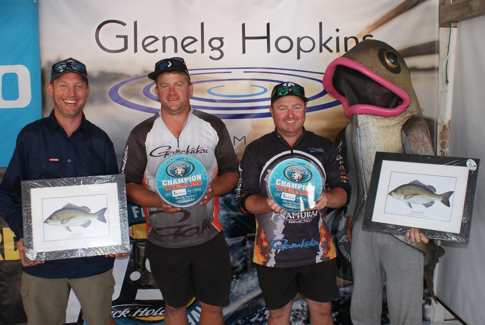 Team Samurai's Dan Mackrell and Declan Betts have taken out the Glenelg Hopkins CMA Bream Classic with 10/10 Bream for 6.43kg followed very closely by Team Krazi Kat's Ryan Newman and Kobie Rothall with 10/10 bream for 6.42kg. Rounding out 3rd position was Team Just Winging It's Chris Allwood and Jack Allwood who weighed in 10/10 Bream for 6.24kg