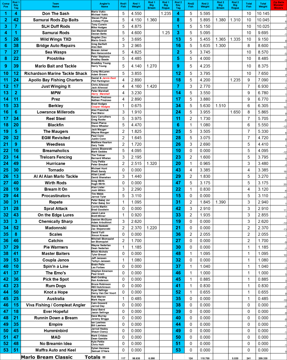 Marlo flexed it muscles this weekend and produced some seriously tough fishing for anglers on Day 1, but Day 2 the big bream came out to play with some cracking bags hitting the scales. For Father Son Team Don The Sash Mario and Mikey Vukic they produced a fantastic weekend of fishing and stormed home from 4th place on Day 2 to claim victory with 10/10 bream for 10.145kg.. In 2nd Place was Team Samurai Rods Zip Baits Stephen and Lindsey Pryke who weighed in 10/10 bream for 10.045kg and in 3rd Place was Team SLH Duff Rods Tony Curwin and Mike Hodges who weighed in 10/10 for 10.025kg.