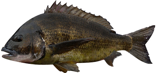 Identification: Yellowfin bream have a silver to olive-green body with yellowish pectoral, ventral and anal fins. They can be distingusished from the black bream by a small black spot at the base of each pectoral fin and a dark banding along the edge of the tail fin.