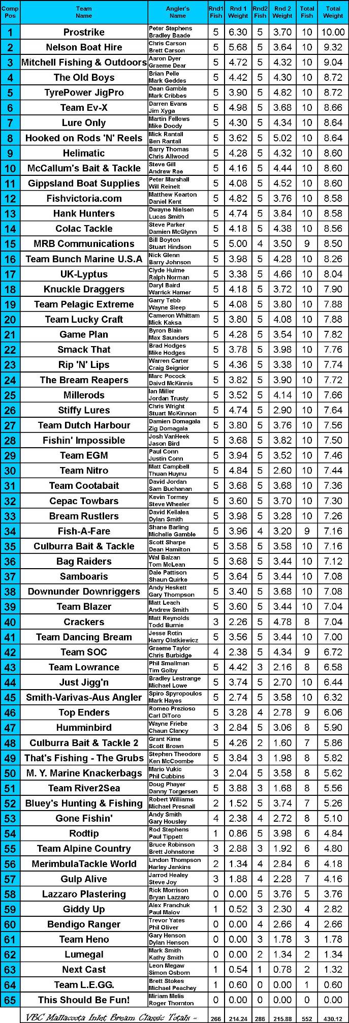 The score board after day 1 was simply unbelievable with 5 bags being weighed in all the way down to 46th position just proving how amazing the fishing at Mallacoota can be. For Team Prostrike Day 2 was sure to be a huge day with the Vic Bream TV camera crew on board to capture their run to victory. By 9am on Day 2 it was evident that the fishing wouldn't be as easy as Day 1 with the quality of bream dropping and the aggressive bite slowing. "We had to vary our retrieve at times from a gentle double hop when the breeze was up to a more aggressive rip when the conditions clamed off" Peter said. With only 20 minutes to go on Day 2 and with only 4 fish in the well the boys felt they would be overtaken for the lead, but just when all hope was lost they hooked and landed their 5th fish a 31cm fork length bream giving them their perfect bag. It was still a nervous wait for Team Prostrike as although they had a full bag of 5 bream they only managed to weigh in a modest 3.7kg on Day 2 and with 25 other teams weighing in heavier bags on Day 2 a come from behind victory could have potentially ruined their weekend. Luckily for the boys their Day 1 6.3kg Berkley Best Bag was enough to hold off the charge from the rest of the field and they managed to get over the line by 680grams to be crowned the 2009 Makocraft East Gippsland Bream Classic Champions.