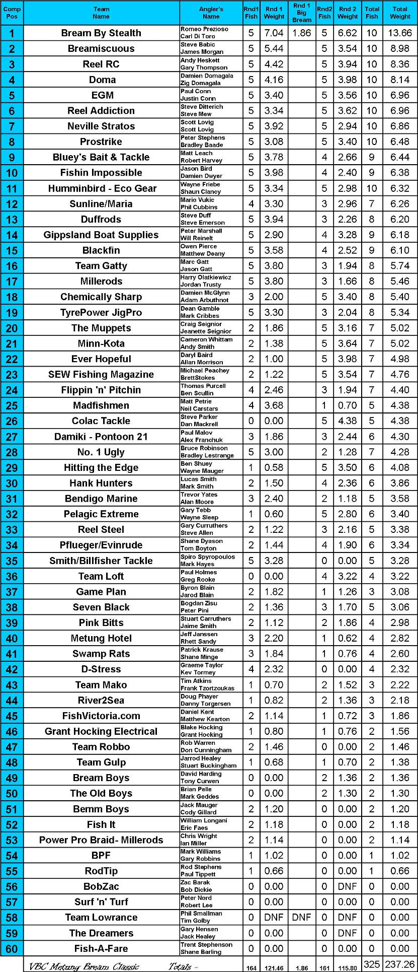 Day 1 of competition saw anglers awake to picture perfect conditions with no wind, blue skies and a slight chill in the air. Blasting off from 18th position the boys from Bream By Stealth made the 40km run to Holland's Landing where they began searching the edges with long casts for the large bream they knew were in the area. "We fished this area 2 days prior to the pre-fish ban & managed to produce a 6kg plus bag. Knowing that the majority of the field would be in the Tambo, we made the decision to take a chance of finding the fish where they had been 2 weeks previously. It wasn't until 11:30am on Saturday that we had found the fish approx 300m from where they had been 2-weeks ago & fortunately it payed off for us" Romeo said. Holding there nerve and staying in the area that produced the fish 2 weeks prior even though not a fish had been boated until 11.30am was a master stroke by the guys because not only did they find the fish but in a hot bite they had their bag in 45 minutes and after looking in the well and seeing some quality bream they left the fish biting so they could return on day 2 again. A quality bag was an understatement as the 5 bream in their bag pulled the scales down to 5/5 bream for 7.04kg a new Humminbird Bream Classic Series 1 day record and easily took out the Atomic Bassday Best Bag for the tournament. Mixed in nicely in their Day 1 bag was the 1.86kg Eco-Gear Big Bream. "We knew that Saturday's bag would be in the high 6kg range, but didn't expect it to top 7kg" Romeo said. With such an expressive start all eyes were on Bream By Stealth to see if they could repeat their efforts in Day 2 or if it was all just a bit of luck.