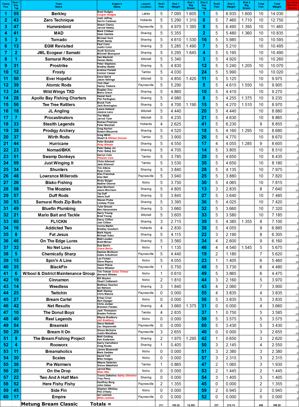 The Zip Baits Monster Movers Prize went to Team Stealth Legends who weighed in a huge Hollands bag on Day 2 of 5/5 bream weighing 6.230kg moving them 23 places up the leader board to finish in 18th position.